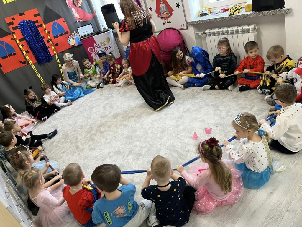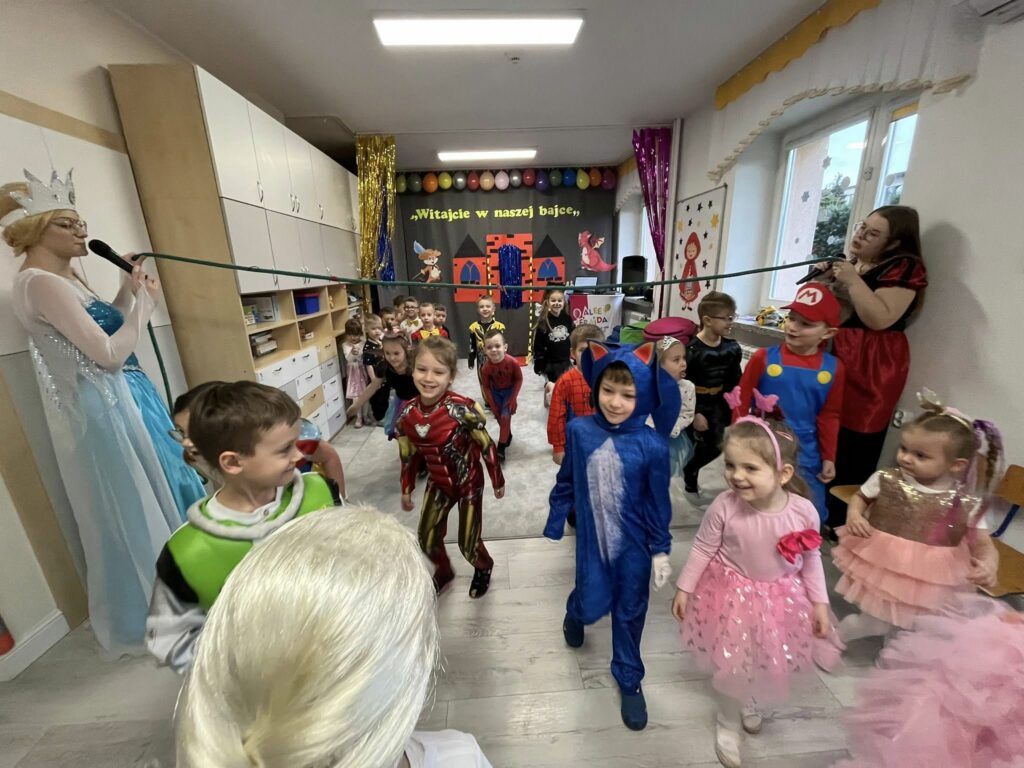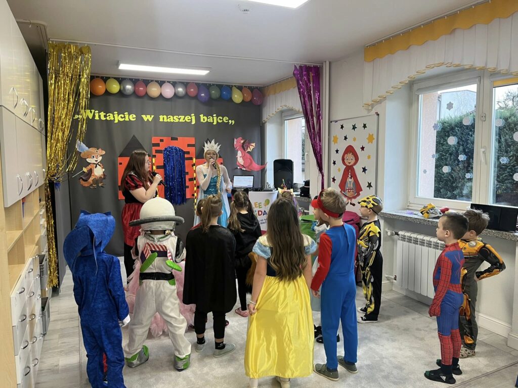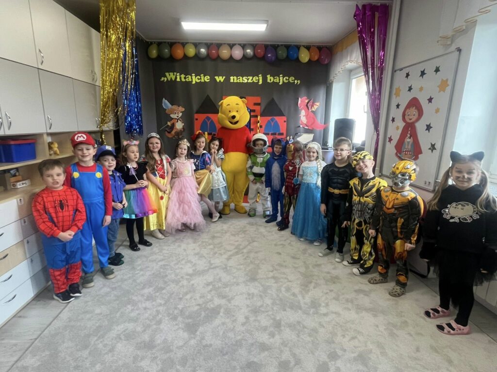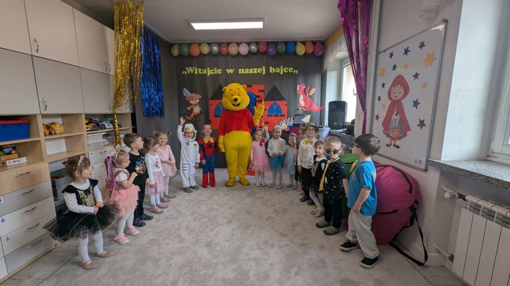 Bal w naszym przedszkolu był pełen radości i dobrej zabawy. Nie zabrakło wyjątkowego gościa – odwiedził nas Kubuś Puchatek, który wywołał ogromne uśmiechy na twarzach dzieci.